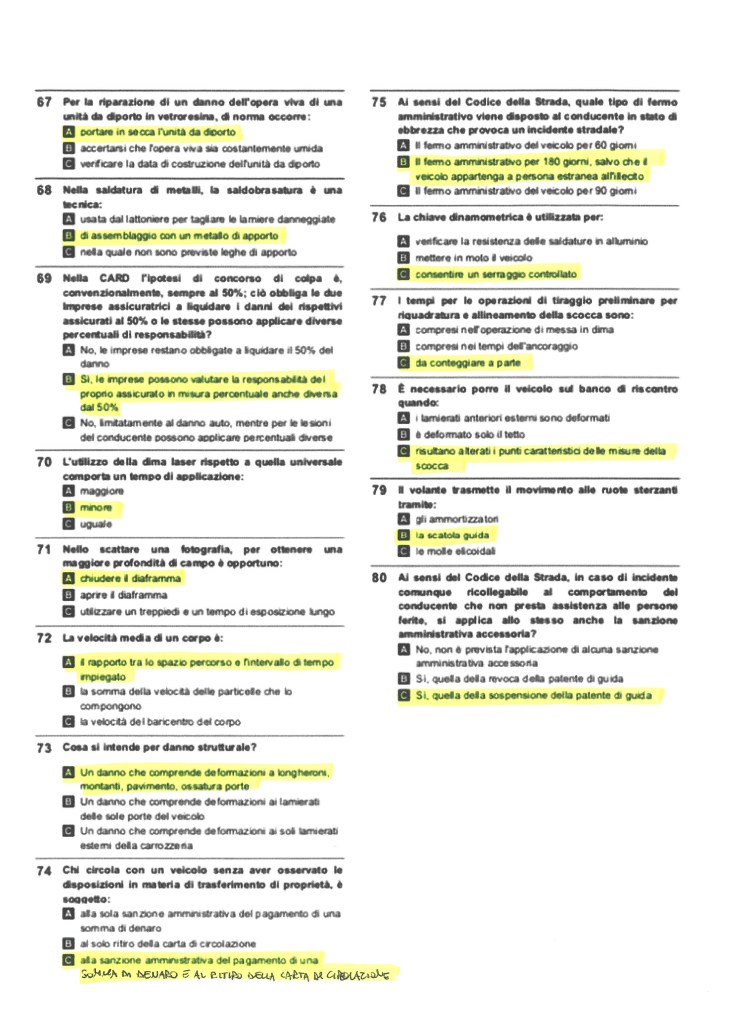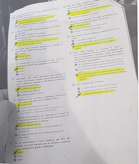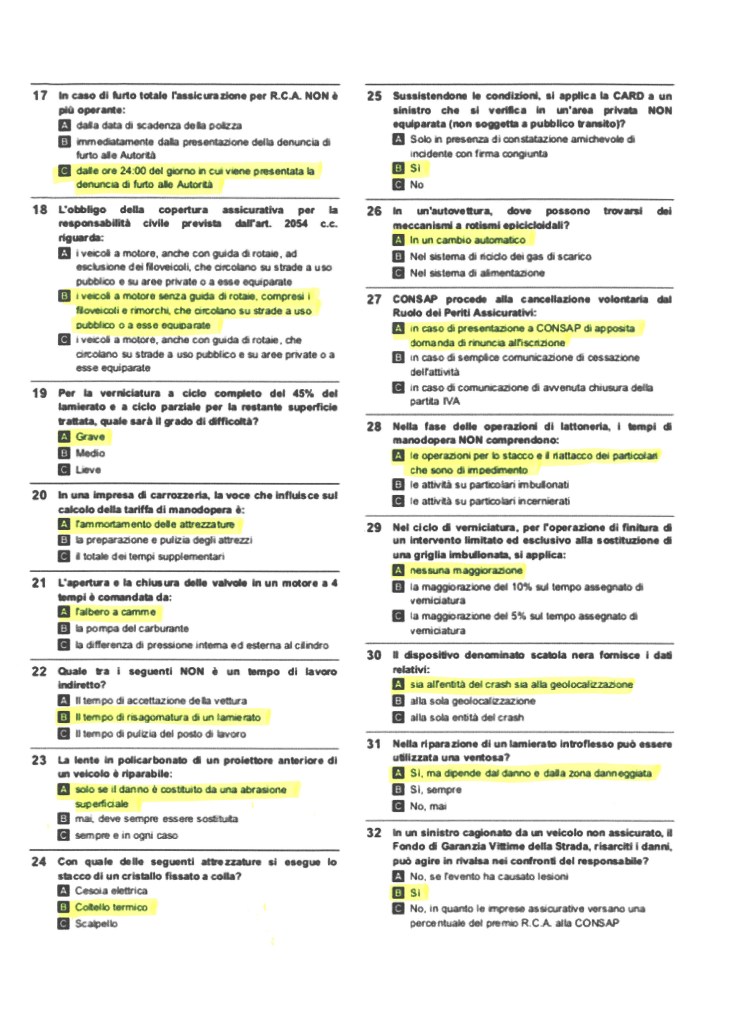 Prova teorica: è composta da 80 domande a risposta multipla, in cui ogni quesito prevede tre possibili risposte, delle quali una sola è quella corretta. Il tempo a disposizione per il completamento della prova è pari a 90 minuti, gli argomenti sono molteplici e spaziano dalla quantificazione danni, alle tecniche di riparazione dei veicoli, dalla fisica di base alla cinematica, dalla tipografia alla fotografia, dal diritto assicurativo alla meccanica, dal Codice della Strada alla nautica. Il materiale distribuito per l’esecuzione del test comprende un libricino contenente le domande ed una scheda separata sulla quale indicare la risposta corretta per ogni singolo quesito. Tale scheda verrà inserita in un lettore ottico che verificherà la correttezza delle risposte. Per ogni risposta esatta viene assegnato 1,25 punti, ogni risposta sbagliata o con marcatura multipla comporta la detrazione di 0,10 punti, mentre le risposte omesse non prevedono alcun tipo di penalità. Per poter accedere alla valutazione della seconda prova, è necessario, su un totale di 80 domande, che almeno 56 siano corrette (pari al 70%).