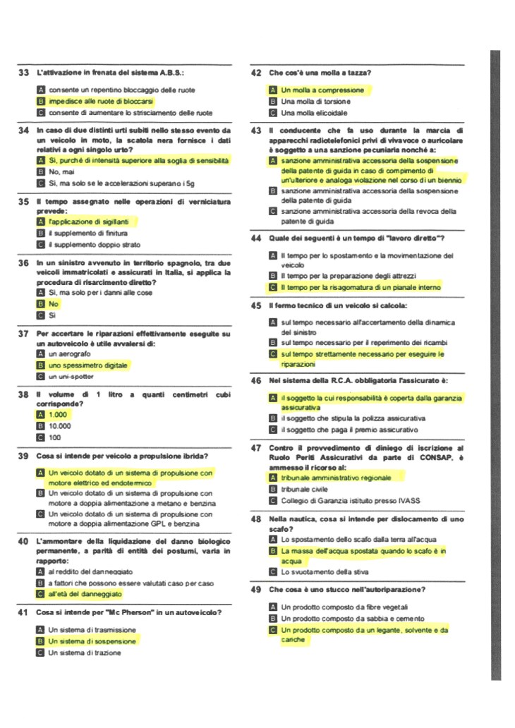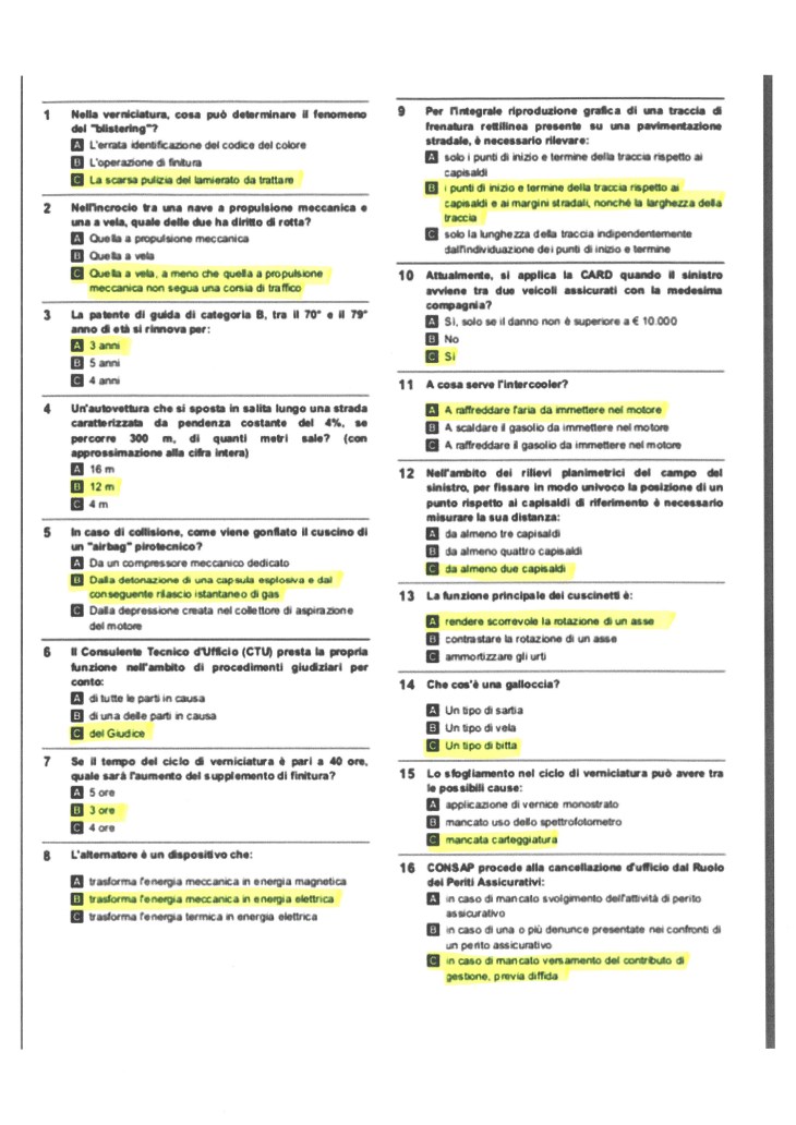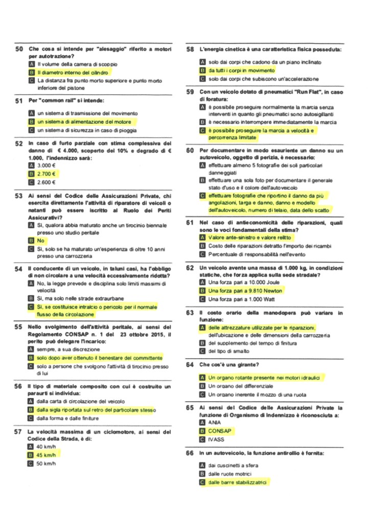 Ricordiamo a tutti gli aspiranti periti che l’esame consisterà in un test a risposta multipla con penalità in caso di risposta errata e una perizia tecnica e si intenderà superato se si raggiunge un punteggio di almeno 70 centesimi in ciascuno dei due elaborati.